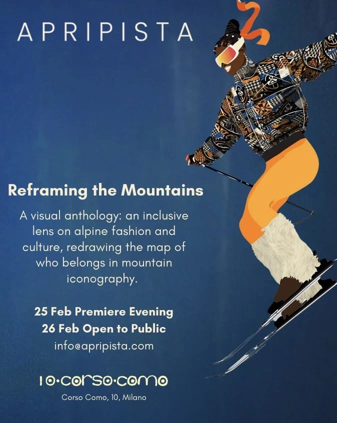 Apripista unveils Reframing the Mountains — Reimagining the Visual Mythology of Alpine Culture, a curated presentation of contemporary poster works reimagining alpine culture through an inclusive global lens. Opening February 25th at iconic 10 Corso Como during Milano Fashion Week — and adjacent to the Milano Cortina Olympic and Paralympic season — the exhibition brings together international fashion designers and visual artists whose practices are shaped by heritage, craft, and cultural memory.